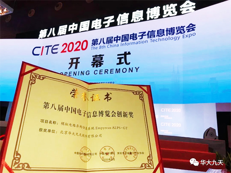2020年8月14日至16日,由工业和信息化部和深圳市人民政府联合主办的第八届中国电子信息博览会(CITE) 在广东深圳会展中心举行。在展会期间,由组委会主办的“中国电子信息博览会创新奖”评选结果揭晓——华大九天“模拟电路异构仿真系统Empyrean ALPS-GT”获得“第八届中国电子信息博览会创新奖”。