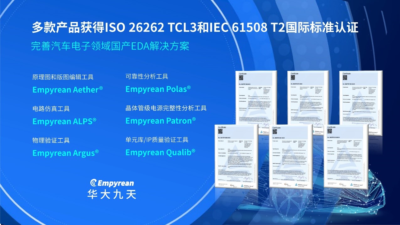 据华大九天2023年年报披露,其原理图/版图编辑工具Empyrean Aether®、电路仿真工具Empyrean ALPS®、物理验证工具Empyrean Argus® (DRC/LVS) 、功率器件可靠性分析工具Empyrean Polas®、晶体管级电源完整性分析工具Empyrean Patron®及单元库/IP质量验证工具Empyrean Qualib®共六大产品均已获得ISO 26262 TCL3和IEC 61508 T2国际标准认证证书。这代表华大九天以上产品具备对汽车安全完整性标准最高ASIL D级别芯片设计的支撑能力,并已形成包含车规模拟EDA工具、车规数字EDA工具和车规平板显示EDA工具等在内的较为完善的汽车电子国产EDA解决方案。