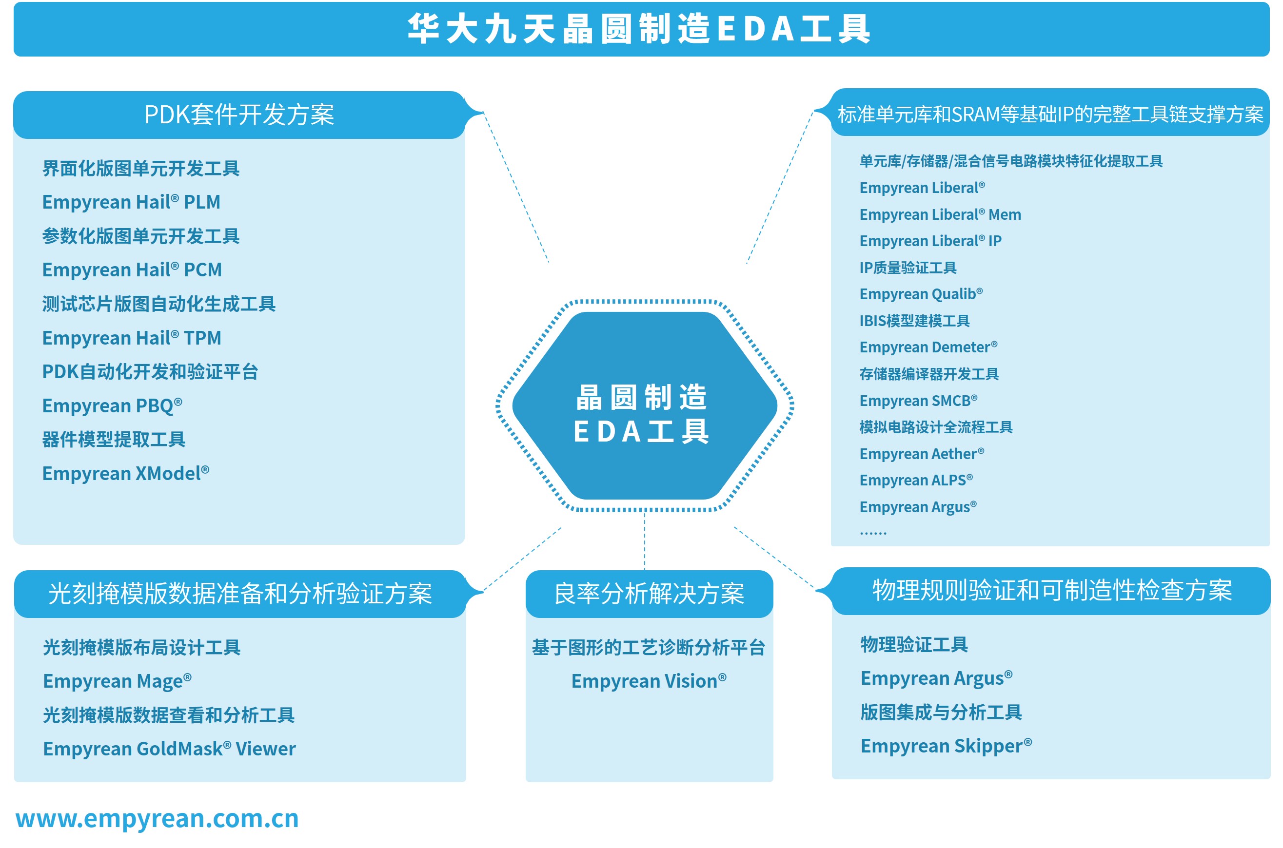 华大九天在已有工具基础上,在晶圆制造EDA的多个细分领域形成了多个解决方案,包括 PDK套件开发方案、标准单元库和SRAM等基础IP的完整工具链支撑方案、光刻掩膜版数据准备和分析验证方案、物理规则验证和可制造性检查方案等,为晶圆制造厂提供了重要的工具和技术支撑。