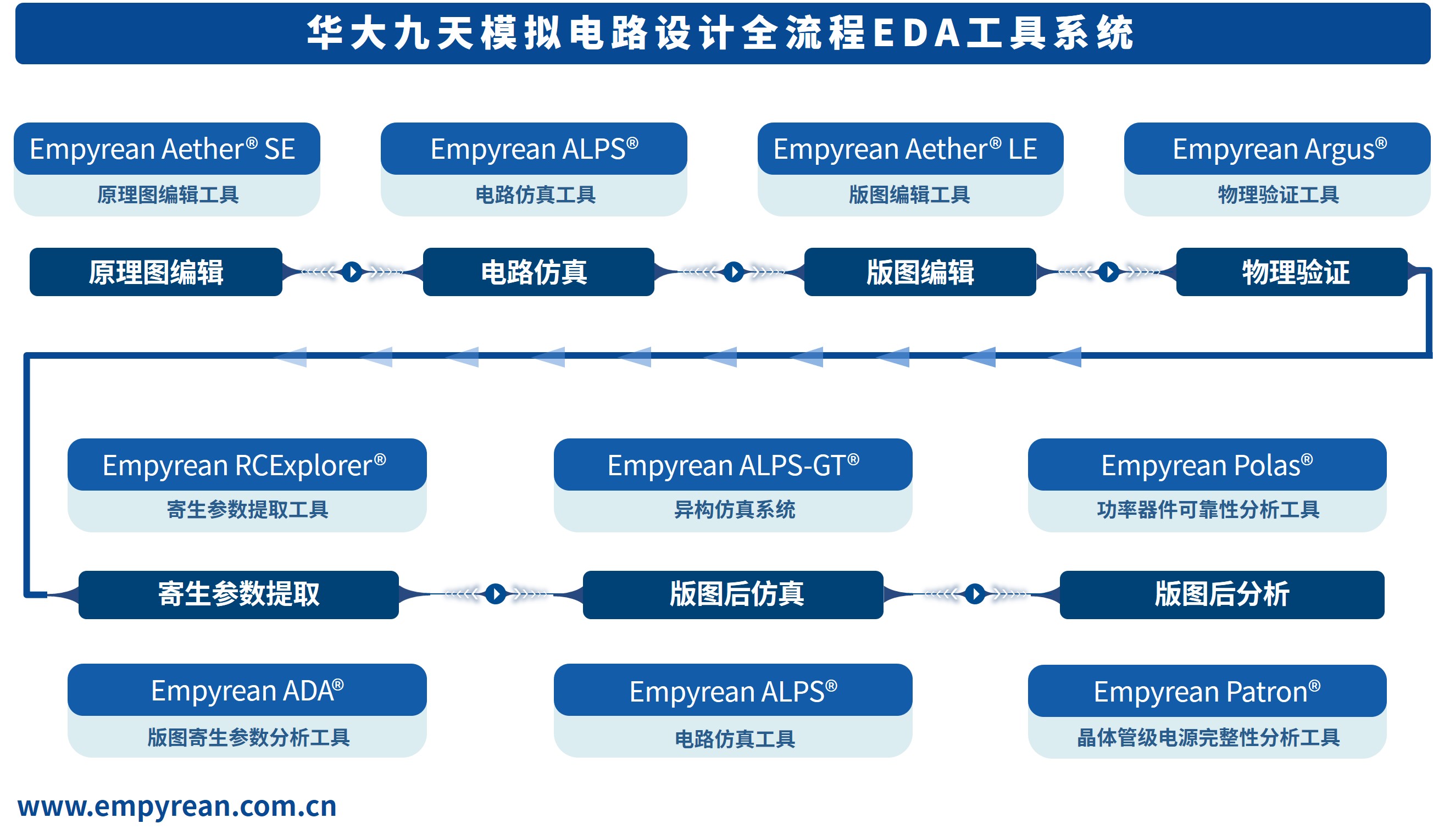 华大九天模拟电路设计全流程EDA工具系统包括原理图编辑工具、版图编辑工具、电路仿真工具、物理验证工具、寄生参数提取工具和可靠性分析工具等,为用户提供了从电路到版图、从设计到验证的一站式完整解决方案。